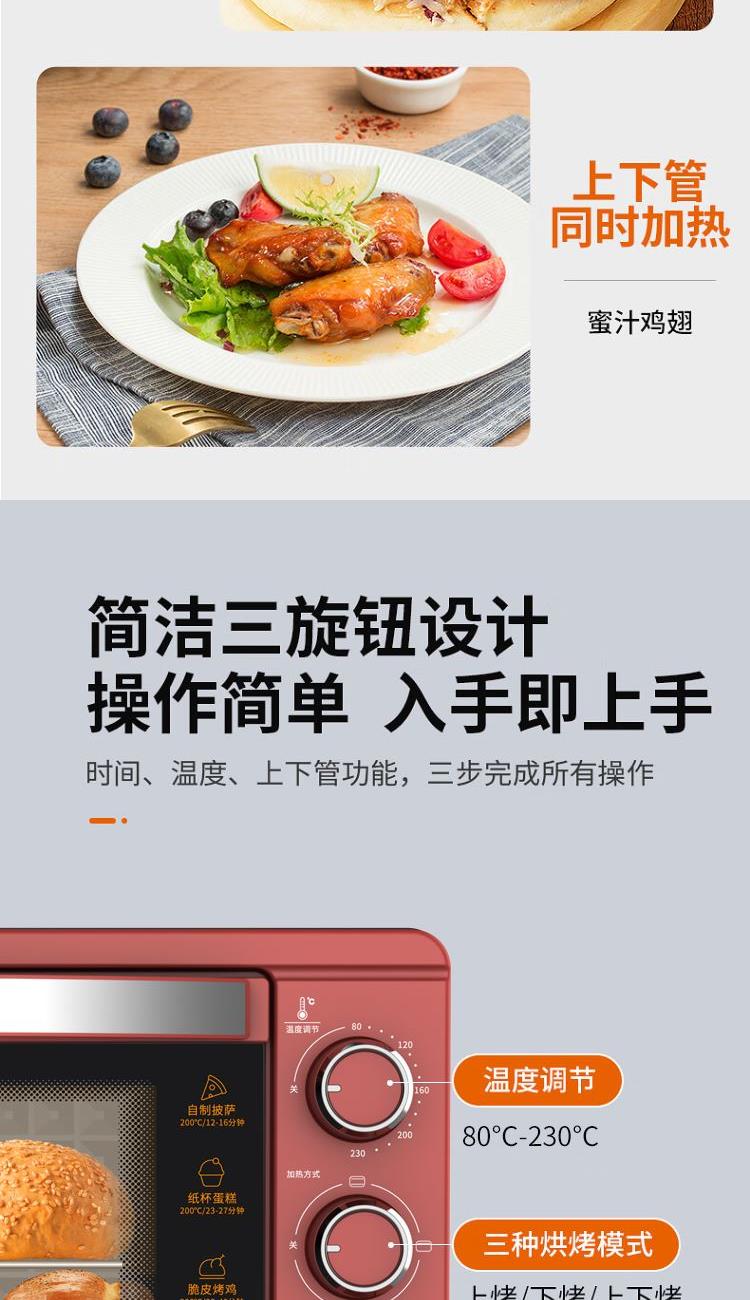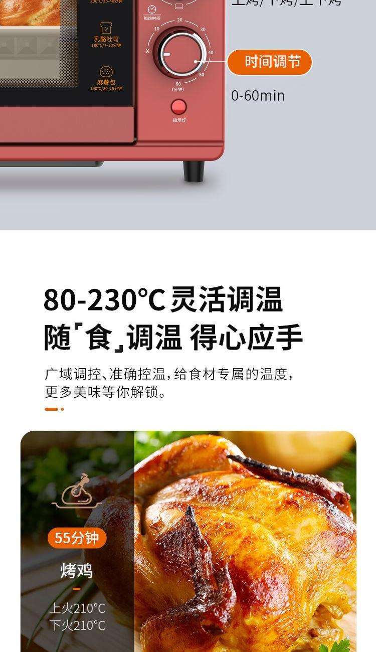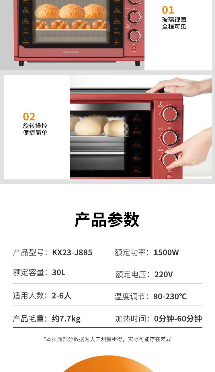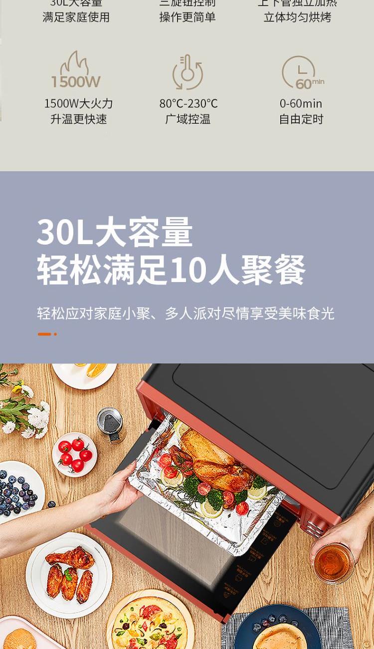"1、30L家庭大容量,多层烤位; 2、三种加热模式,上下独立加热; 3、0-60min定时,80-230℃控温; 4、简洁三旋钮设计,操作便捷; 5、1500W大火力,快速升温; 6、可视化玻璃窗,分段停顿门。 "