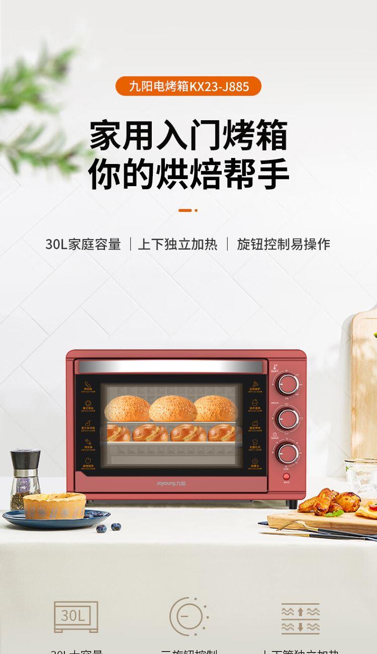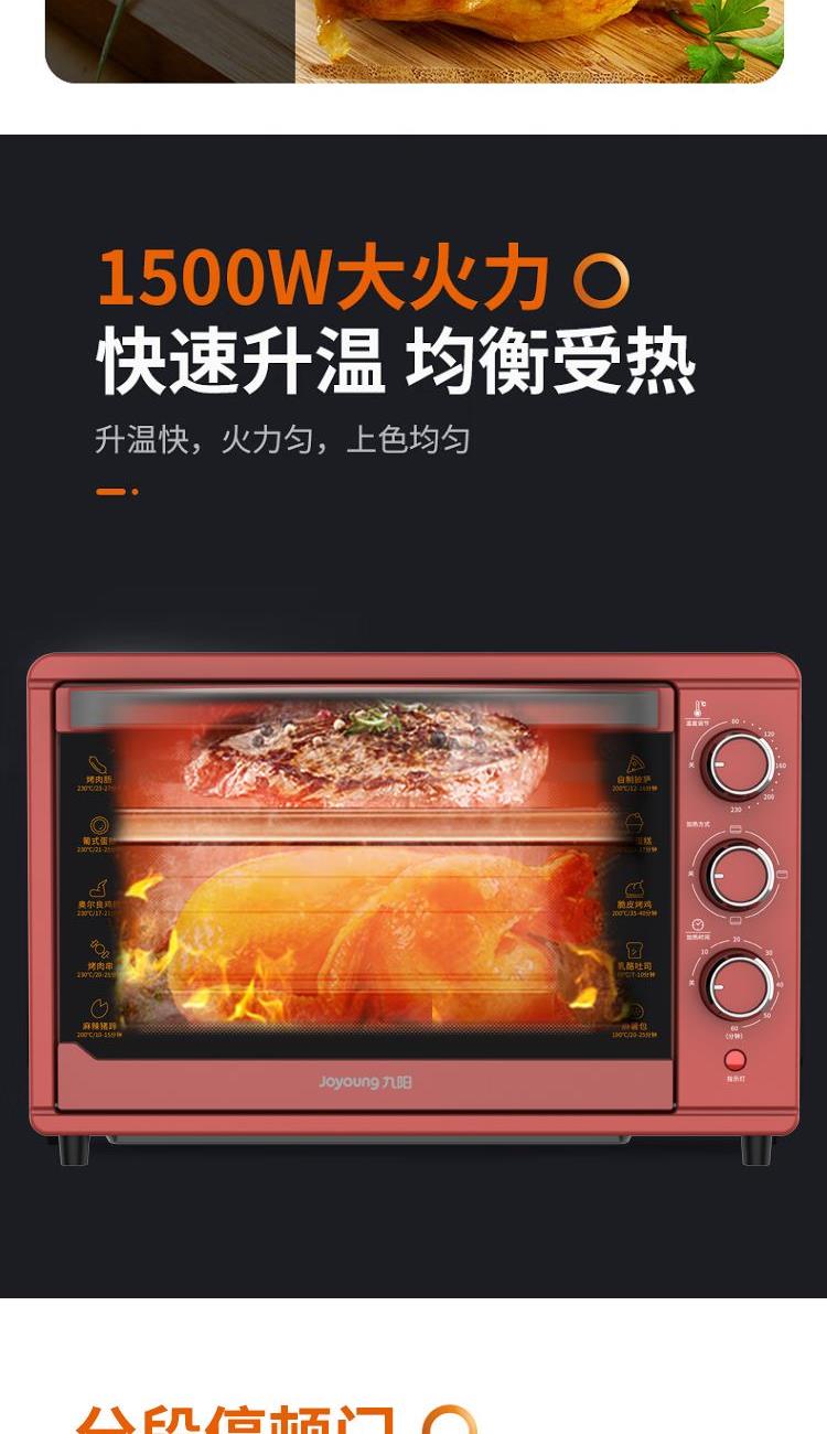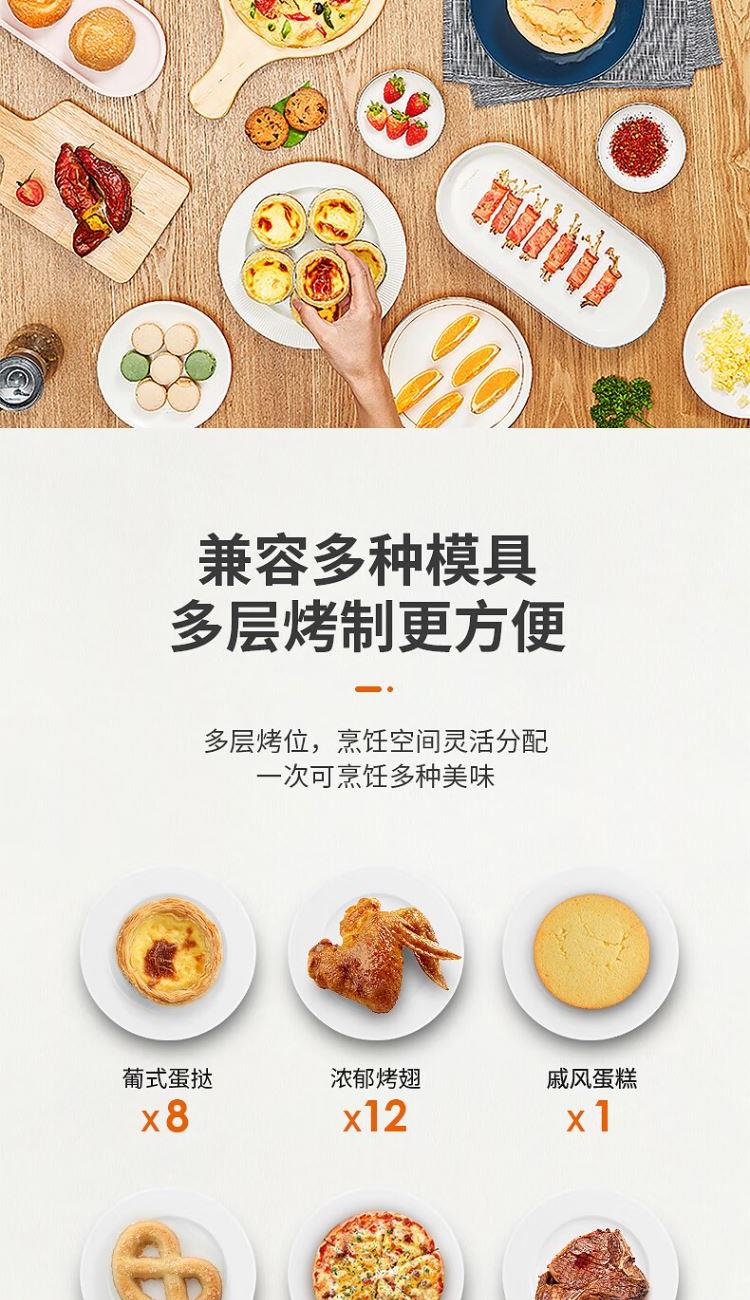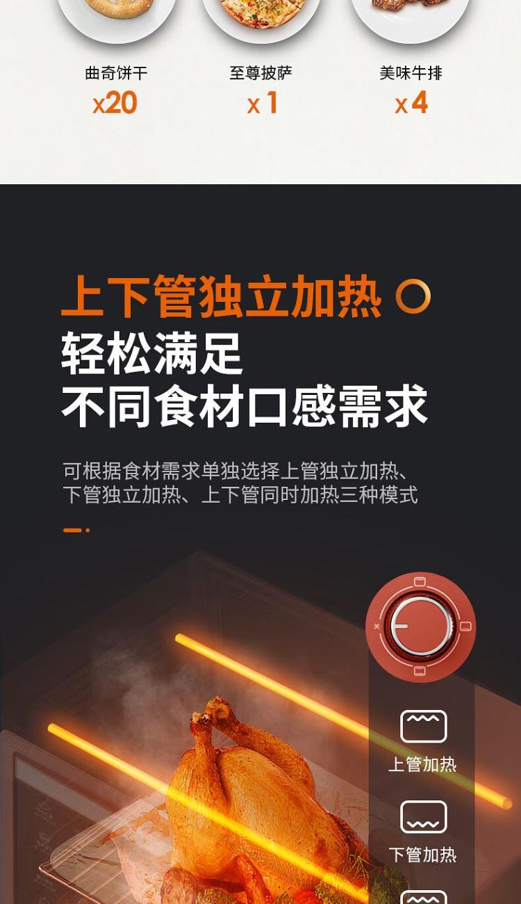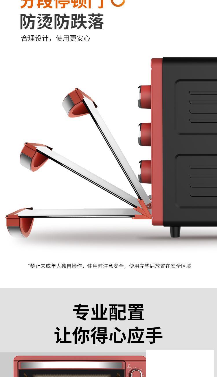 "1、30L家庭大容量,多层烤位; 2、三种加热模式,上下独立加热; 3、0-60min定时,80-230℃控温; 4、简洁三旋钮设计,操作便捷; 5、1500W大火力,快速升温; 6、可视化玻璃窗,分段停顿门。 "