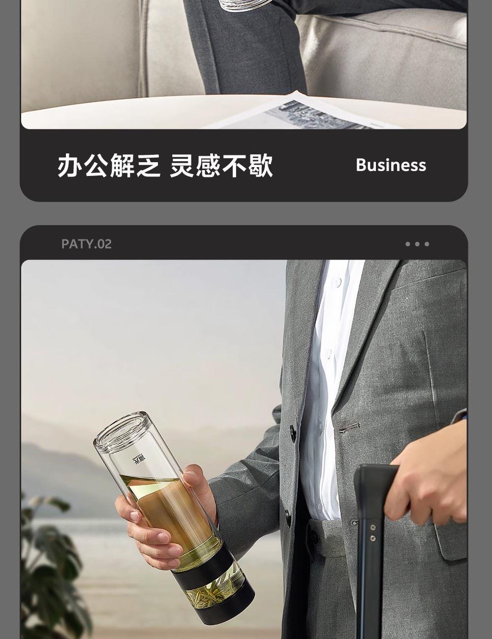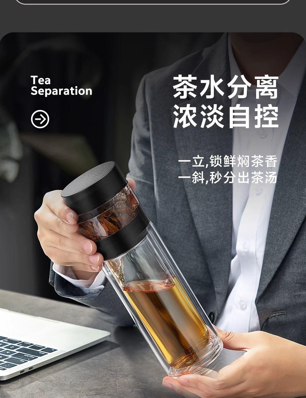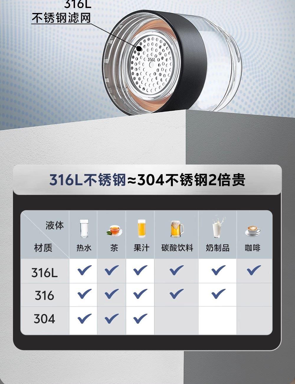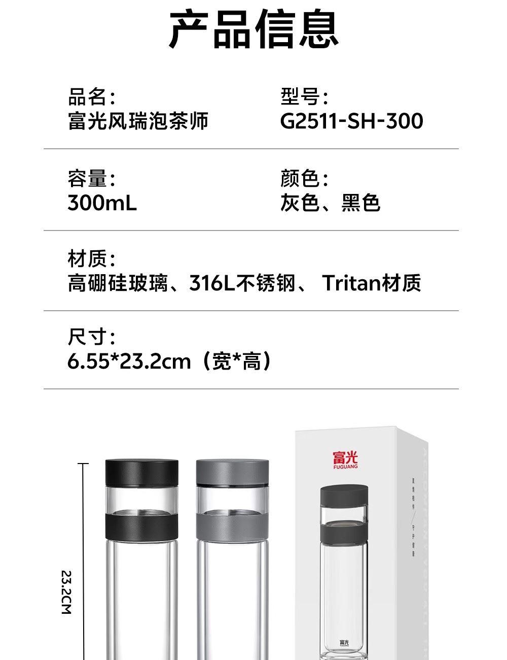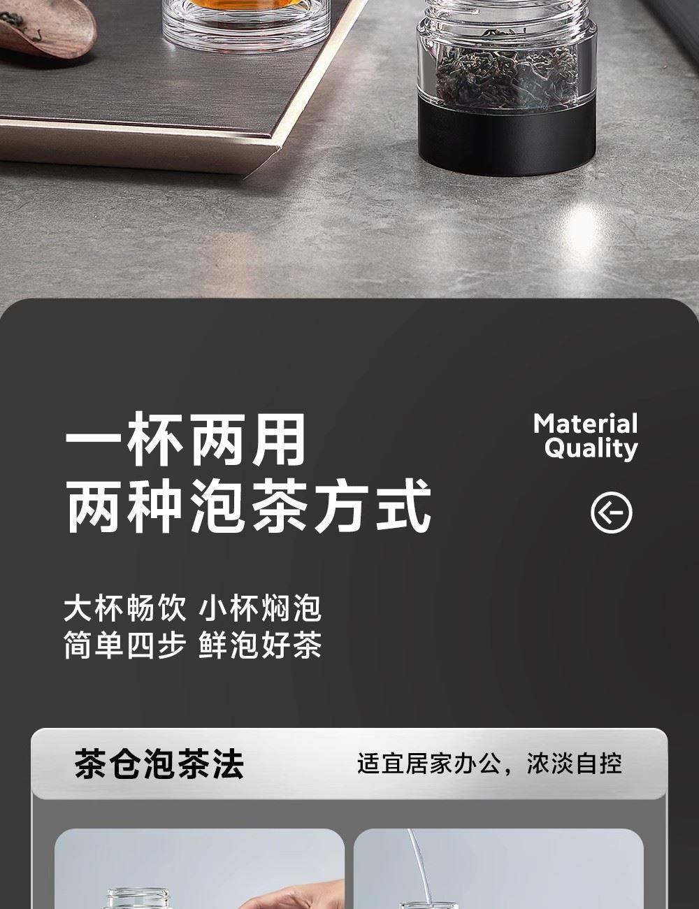 容量:300ml 颜色:灰色 蓝色 尺寸:65.5*232mm 材质:铂金级双层高硼硅,加厚一体成型杯底。 金额数磨砂质感杯盖,316L不锈钢,婴幼儿级Tritan独立茶仓。 两种泡茶方式自由选择,一杯两用,大小杯随意切换(去掉茶仓秒变随行小杯),一立一斜实现茶汤分离。 包装:单瓦盒