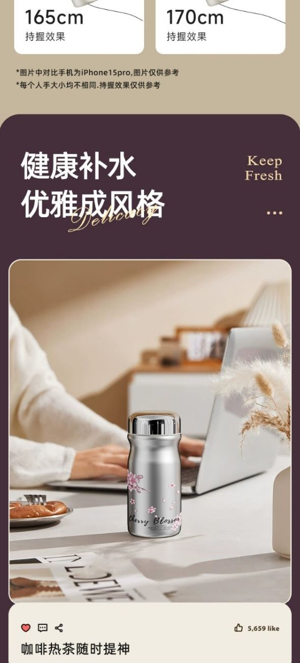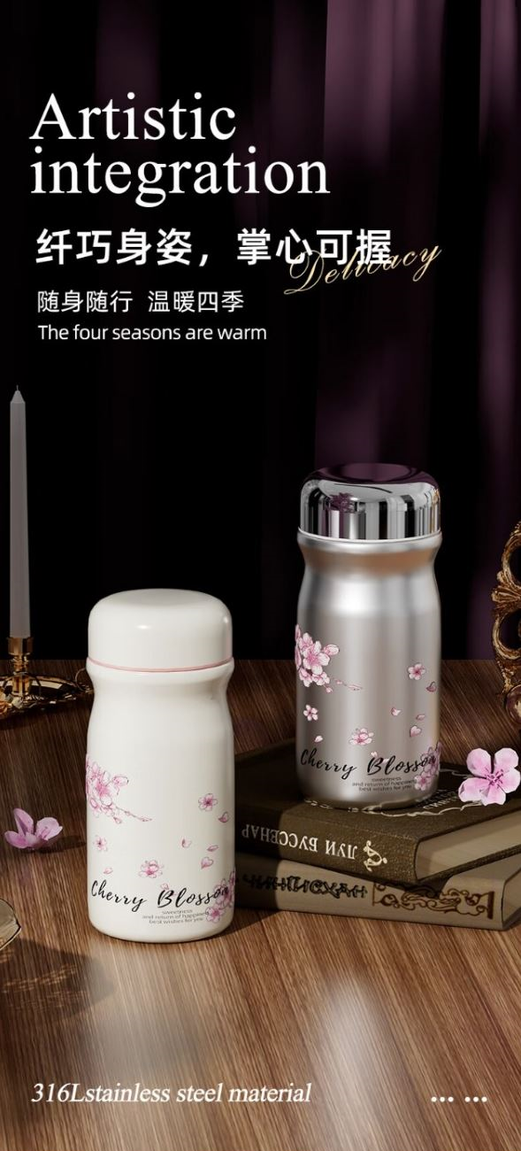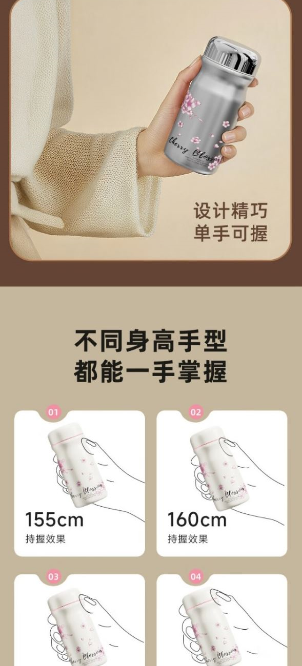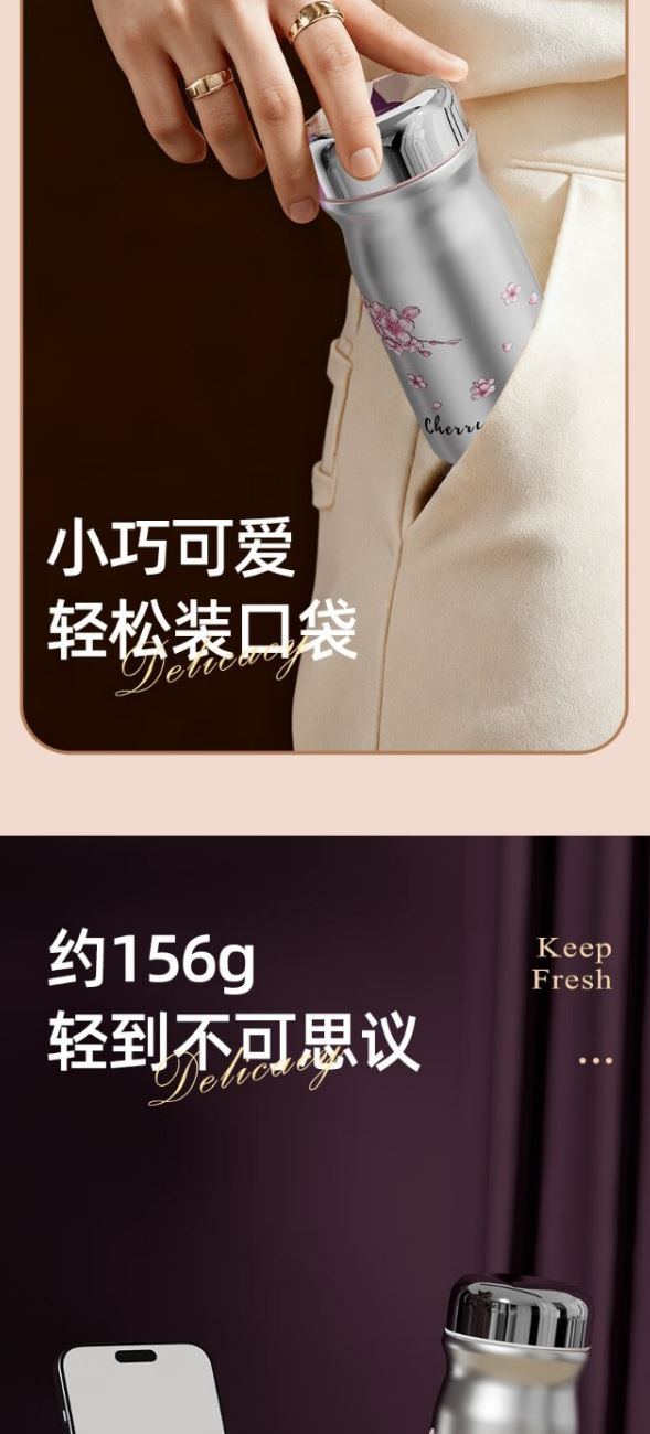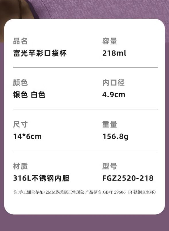 颜色:银色 白色 容量:218ml 尺寸:60*140mm 材质:316L奥氏体不锈钢内胆,316L不锈钢回流盖。 无尾真空超长保温。 超轻杯身设计,一体成型无缝内胆,随心泡饮,无惧酸碱。 包装:单瓦盒